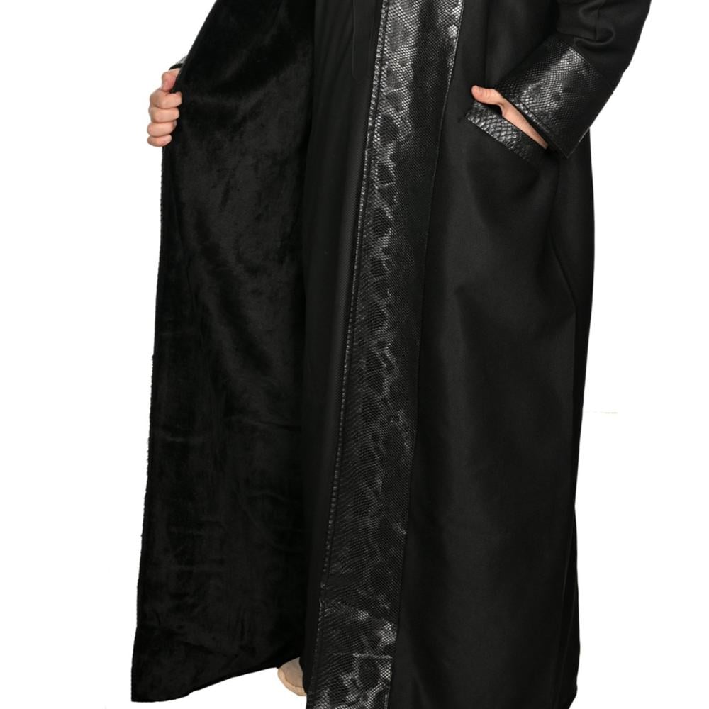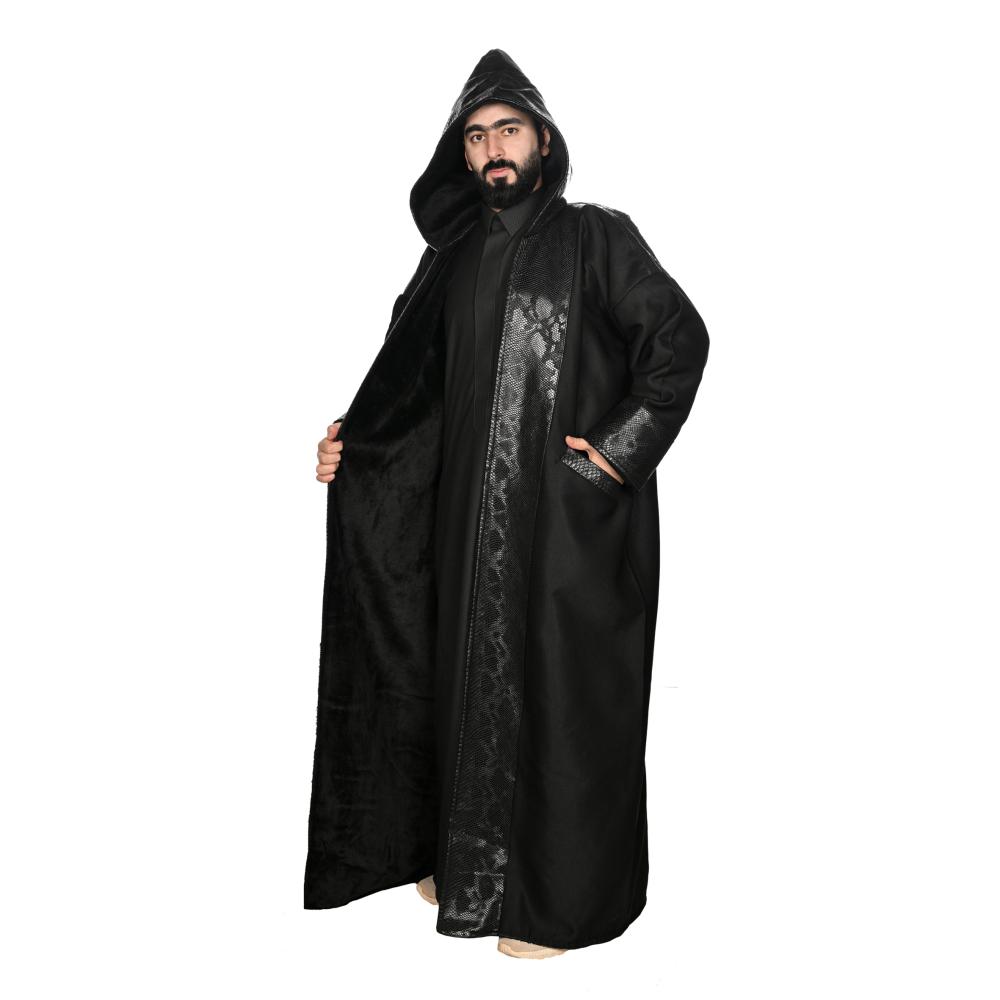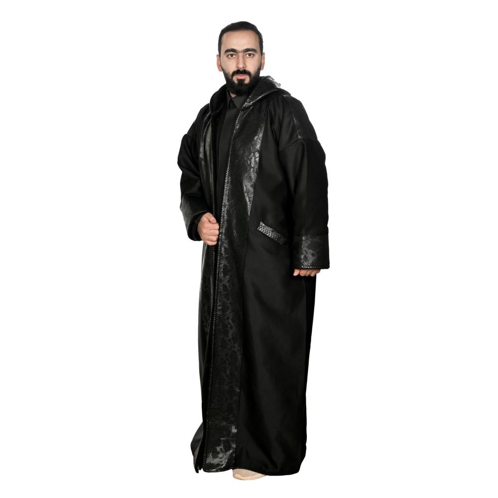 A luxurious black men's abaya that combines traditional design with modern touches to suit all formal and informal occasions. Made of high-quality fabric that provides comfort and durability, with elegant shiny leather trims on the edges and sleeves that add a sophisticated and attractive touch. The abaya features a comfortable cut and a wide design that ensures ease of movement, with a built-in hood that reflects classic elegance in a modern style. An ideal choice for the man looking for luxury and originality in his appearance.
