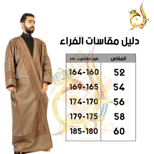 The Bisht measurement is taken from the middle of the shoulder to the thumb in inches, and the resulting number is the appropriate size for you.